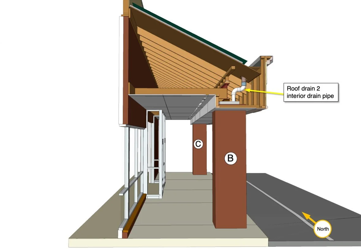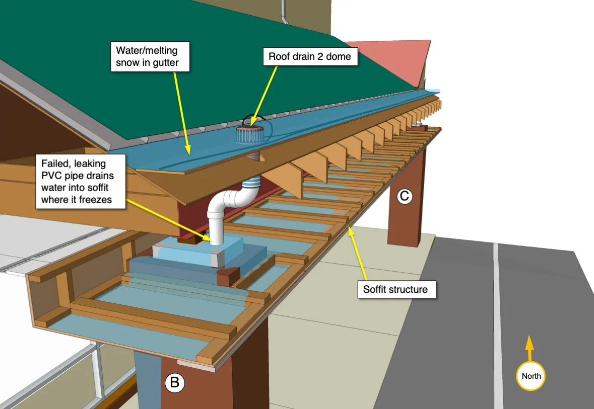 Drake Exhibits was retained by the plaintiff’s attorney to create graphic exhibits depicting the accident scene. A site inspection was conducted to acquire measurements of the site so that the exhibits produced would be a fair and accurate representation. During the site visit, the interior of the roof overhang was accessed through a ventilation grill. Inside, the PVC drainpipe was visible and had obviously been replaced since the accident. The fractured pieces of the previous drainpipe had been left there by the repair crew – physical evidence the drain had failed and released water inside the roof structure, allowing the ice build-up to occur.