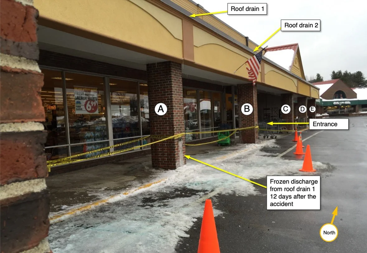 A plaintiff sustained serious injuries in a slip-and-fall accident caused by ice buildup in front of a shopping center entrance. Post-accident photos taken by the plaintiff’s attorney documented serious issues with water drainage from the roof in the area of the accident. An internal drain system had failed and caused water to flow through overhead roof structures. The water then leaked onto the sidewalk, forming ice in sub-freezing temperatures. The building had a history of roof leaks from snow and ice accumulating and then melting. Heat tape had been installed to keep water flowing through gutters and internal drainpipes but had failed some months prior to the January accident.