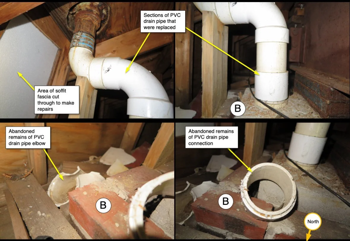 Photos of repaired drainpipe and abandoned remains of the failed pipe show evidence of the repair